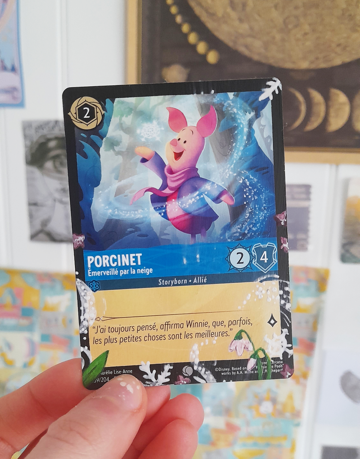 Carte TCG Disney Lorcana peinte à la main (acrylique). Porcinet– Emerveillé par la neige (Carte en français). Lorcana Givresort Chapitre 11. Modification jouable car le texte est toujours lisible (en revanche, aucune garantie qu’elle soit acceptée en tournoi). ⚠️1 seul exemplaire disponible, envoyé rapidement après la commande et mise sous sleeve.